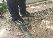 Первым этапом работ будет создание добротного фундамента. Для этого мы вкручиваем четыре металлические сваи, к которым привариваем арматурный каркас.